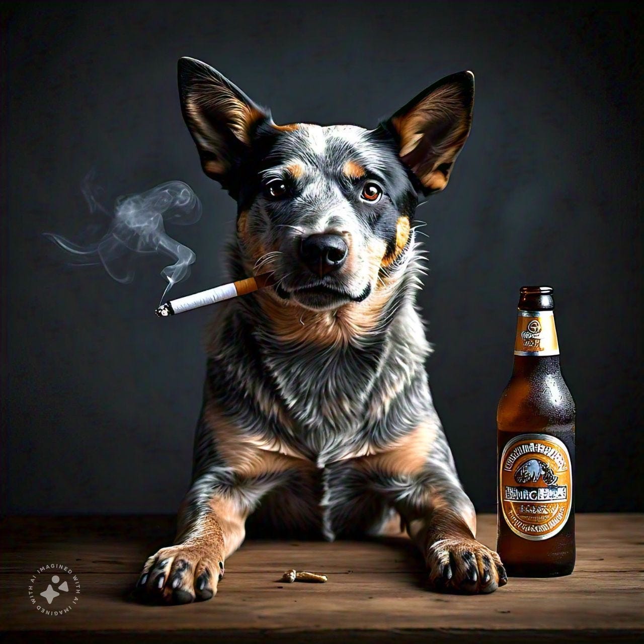 Ah, Tracey the truly liberated Aussiecattler canine sent me a photograph of herself in Character with the usual foul mouthed greeting for this time of the year. I am not too sure of what it is she is saying in her Pose but it may well be a lashing out at her male Colleagues. They never invite her down to the pub after a heavy day Cattle minding. Rumour has it that she is not only marginalised because she breaks union code and just efficiently finishes the job, but also beats them at Armwrestling.